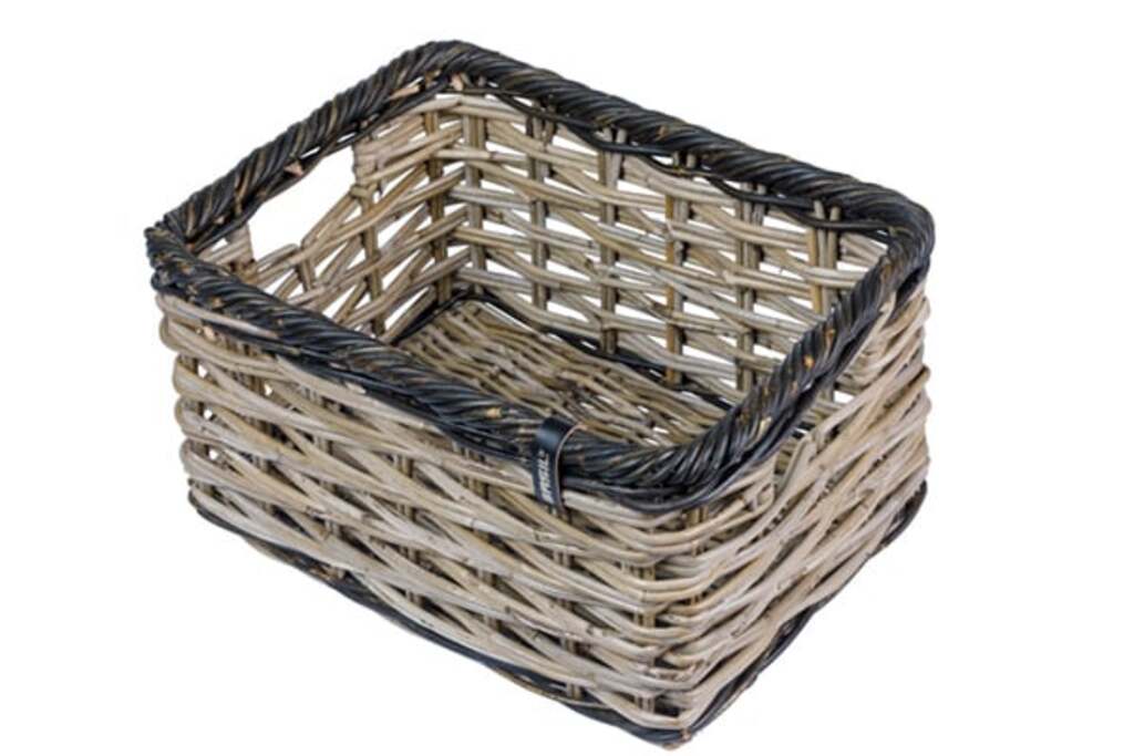 Basil Dijon L, luxe rotan fietsmand, excl. bevestigingsmateriaal, grijs/zwart. afmeting 36 x 49 x 27 cm (Buitenwerkse maten). maar houd er rekening mee dat dit natuurproduct gevoelig is voor weersinvloeden. Ook kan de mand 1 tot 2 centimeter in afmeting variėren.