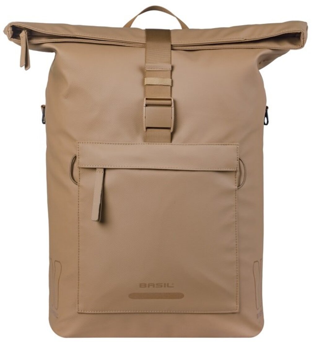 Basil Fietsschoudertas Brooklyn MIK Hooks, 17L, gerecycled PET, waterdicht hoofdvak, waterkerende vouwsluiting met gesp, binnen- en buitenvakken, laptopvak 16 inch, afneembare schouderband, helmbevestiging, handgreep, reflectie