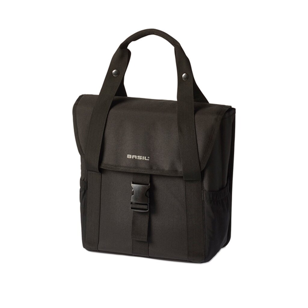 Basil Go-Single Bag. Enkele fietstas voor achterop, gemaakt van hoogwaardig materiaal, hoofdcompartiment met aansnoerkoord, dubbele elastische zijvakken, handgrepen, Hook-On System in ritsvak, dubbele en extra reflectie, inhoud: 16L, Solid Black.